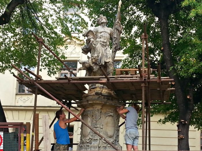 V únoru byla krásná barokní socha demontována a převezena do ateliéru restaurátora Reného Tikala. Pískovcový monument byl poškozen povětrnostními vlivy i působením stromů, které sochu na náměstíčku obklopují. V průběhu restauračních prací se potvrdilo, že poškození bylo opravdu výrazné, hrozilo například ulomení ruky andílka, silně poničena byla drapérie praporce svatého Floriana a staticky narušeno bylo ukotvení celého sousoší. Restaurátoři museli očistit povrch kamene, odstranit krustu, nahradit chybějící části a provést řadu dalších úprav.